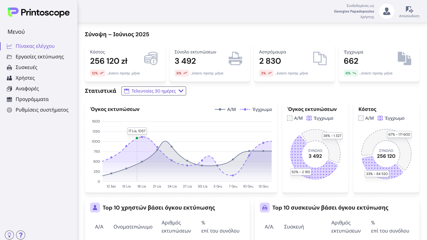 Εκτιμούμε τη συνεργασία με το Printoscope. Χάρη σε αυτό το σύστημα μπορούμε να παρακολουθούμε συνεχώς την κατανάλωση πόρων, να ορίζουμε όρια και να δημιουργούμε αναφορές, αυξάνοντας την αποδοτικότητα και τις εξοικονομήσεις.